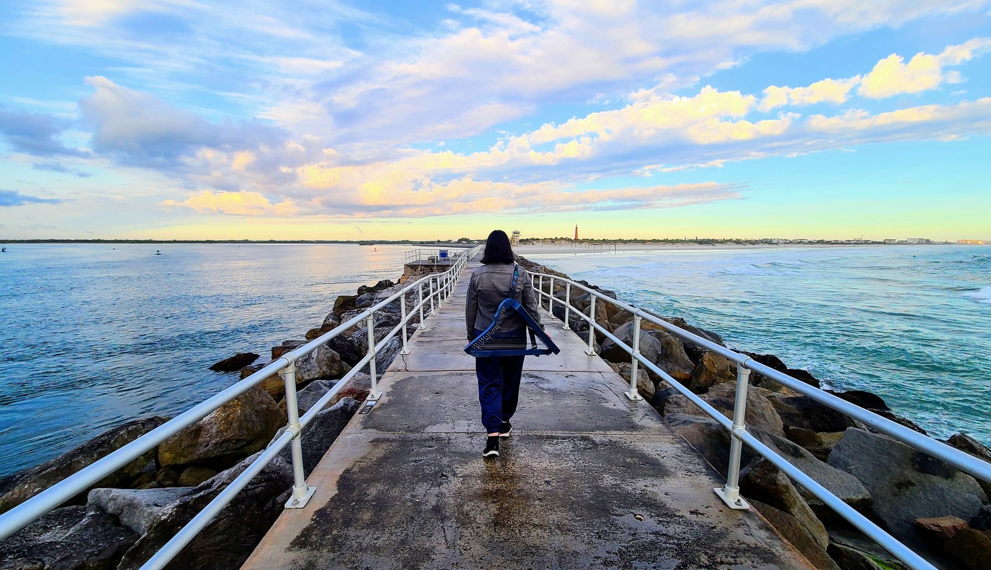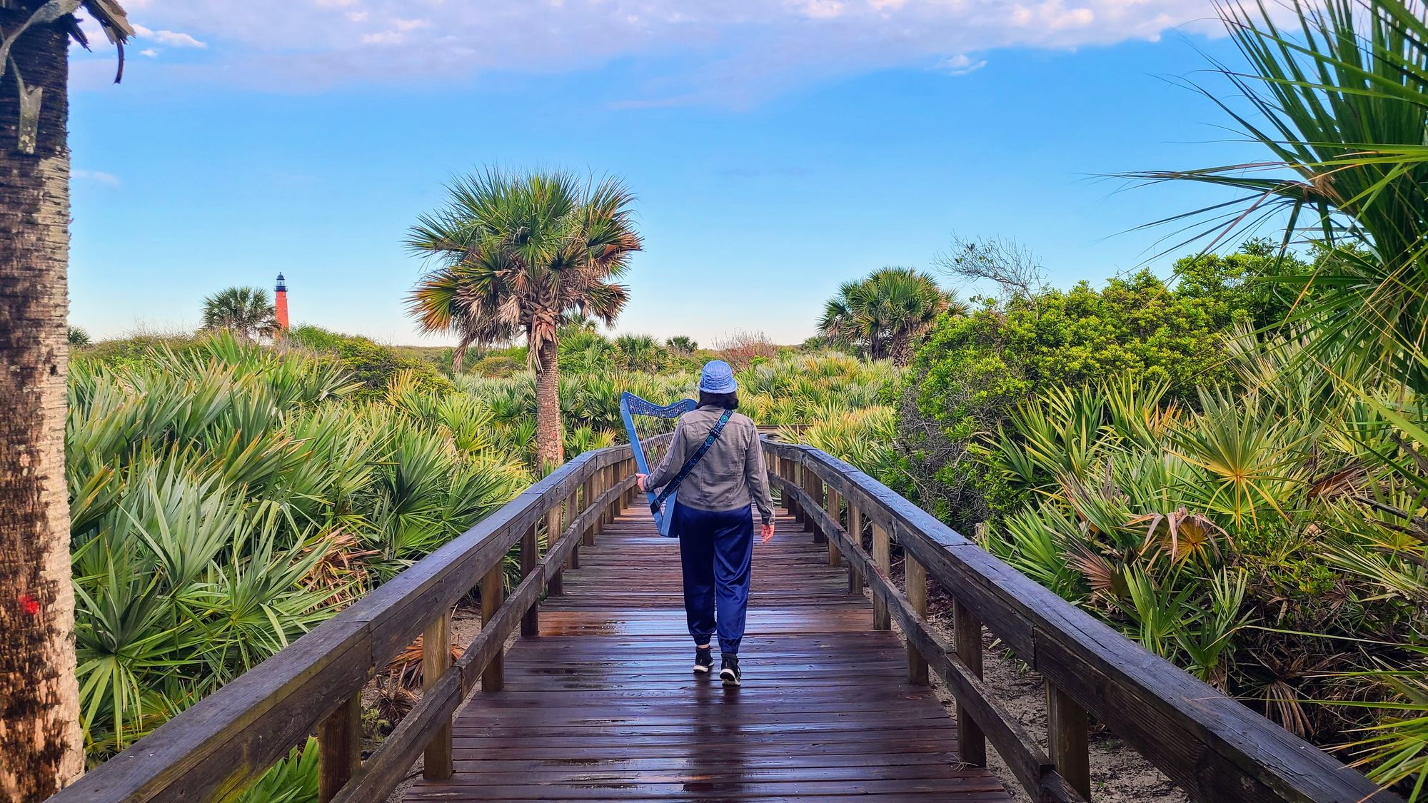 After days of work and rainy weather, it was finally time to take full advantage of our time in Daytona. For us, that's not going to a race or enjoying a beach day. It's taking some nature walks! In 2017 when we road tripped the East Coast, our stop in Daytona was a pleasant surprise, much help due to the gorgeous Ponce Inlet Lighthouse and its wondrous surroundings. The whole Ponce Inlet area is awesome. Whether you want to go to the beach, take your dog to the inlet, walk the boardwalks/jetty, grab some food, visit museums, head out on a boat, or even walk to the top of the lighthouse, you have plenty to keep you busy. The beautiful park is not one to be forgotten, and it was still top of my mind two years later when I started taking my harp into nature. I had this vision of bringing my blue harp down to Daytona, matching it against the ocean, and having a stunning harp hike. How would that be logical, though? We'd have to fly the harp down to Daytona (which we did do when we went to the Everglades), and as much as we love Daytona, it just wouldn't be a destination we would fly to. But now things are different, and RV Life granted me my wish.
