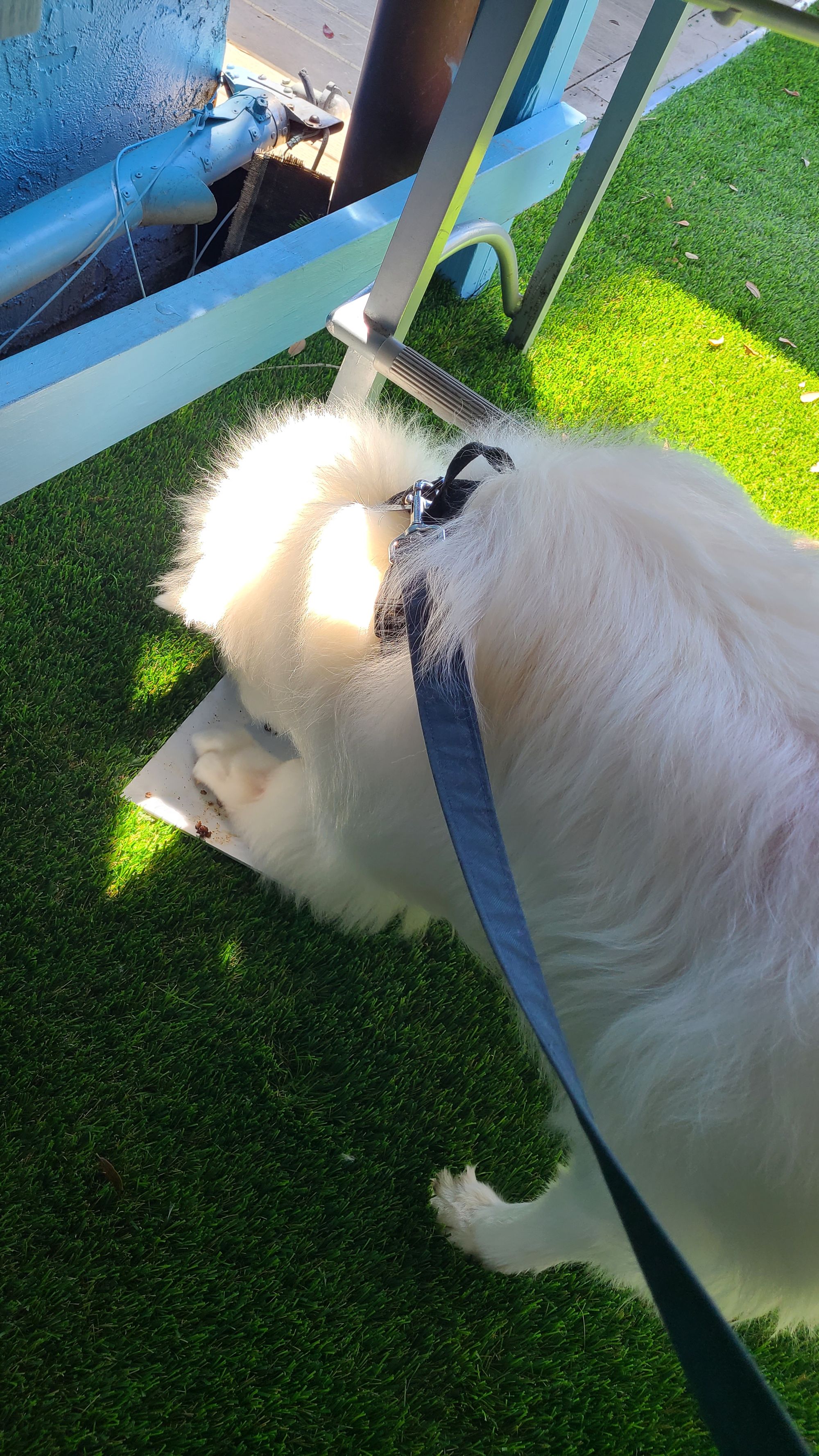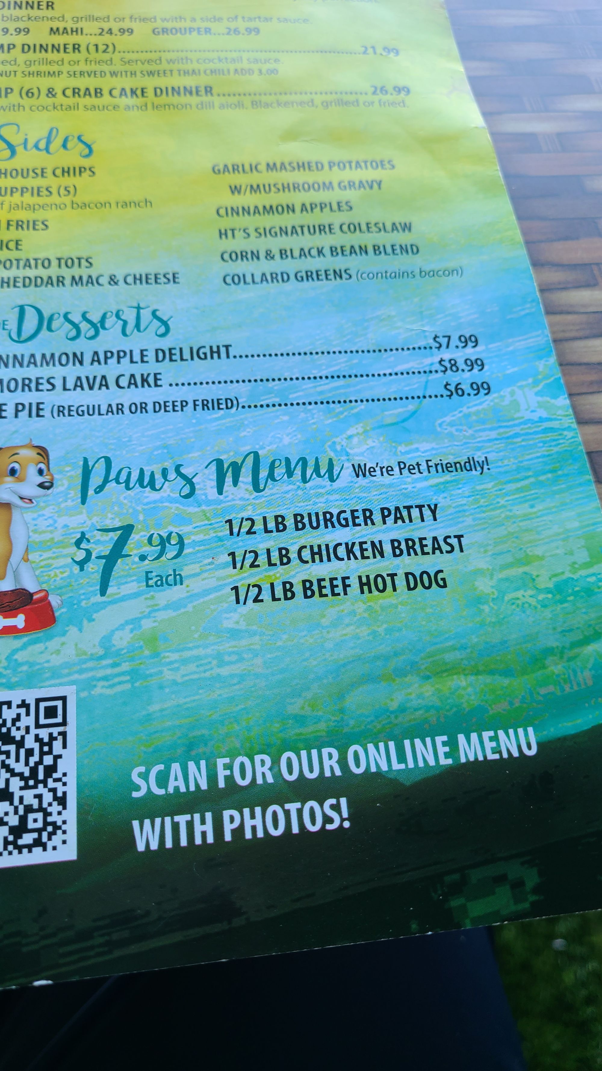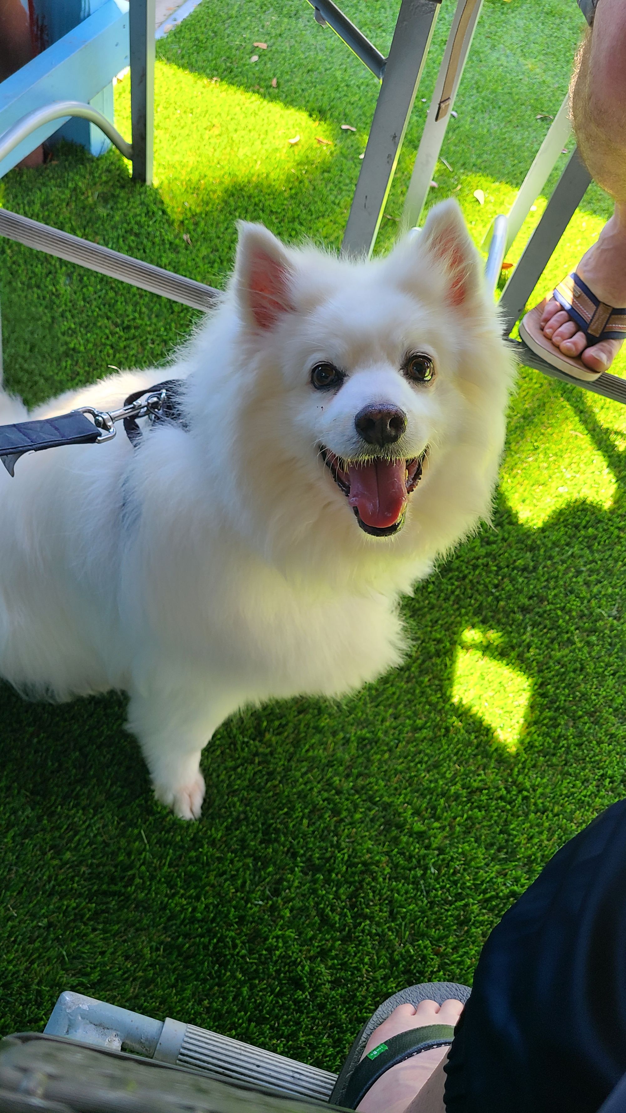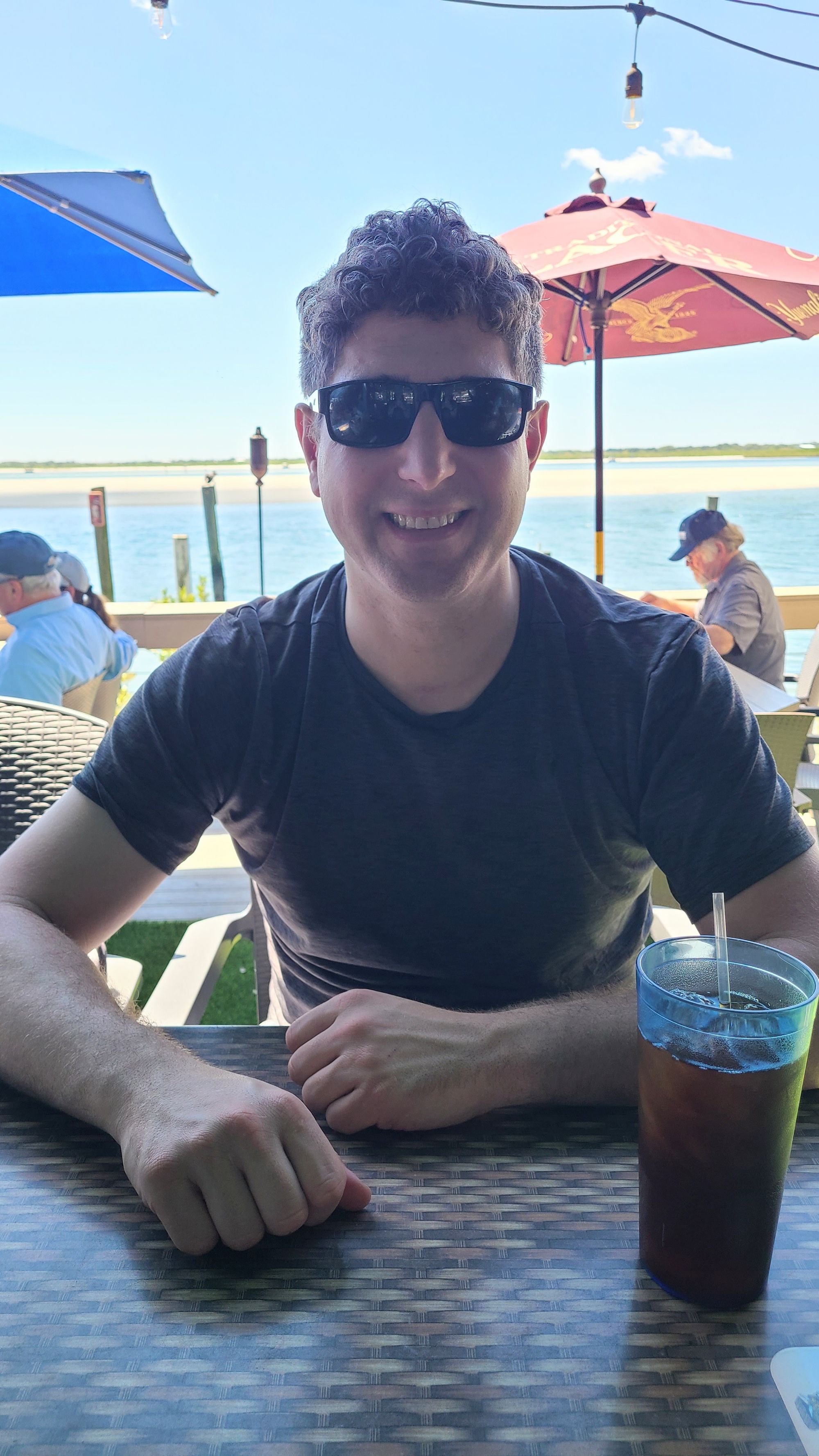 Now don't worry, this day wasn't all about me and the harp. I needed to make sure my boys were having a good time too! Anthony and I decided to head back to the RV and switch out BB the harp for Tanner. Then we went back to Ponce Inlet. Admission to the park is $10, but you get to leave and come back once in the same day. This was perfect for us! Before we went for our walk, though, we decided to take Tanner for his first outdoor dining experience. We had wanted to do it last summer up in MA but ran out of time. I think this was worth the wait. We went to Hidden Treasure, a beach bar and restaurant right across the street from the lighthouse. They allow dogs on their deck and even have a pet menu for them! Tanner was beside himself with glee when the waitress served him his 1/2lb burger patty.