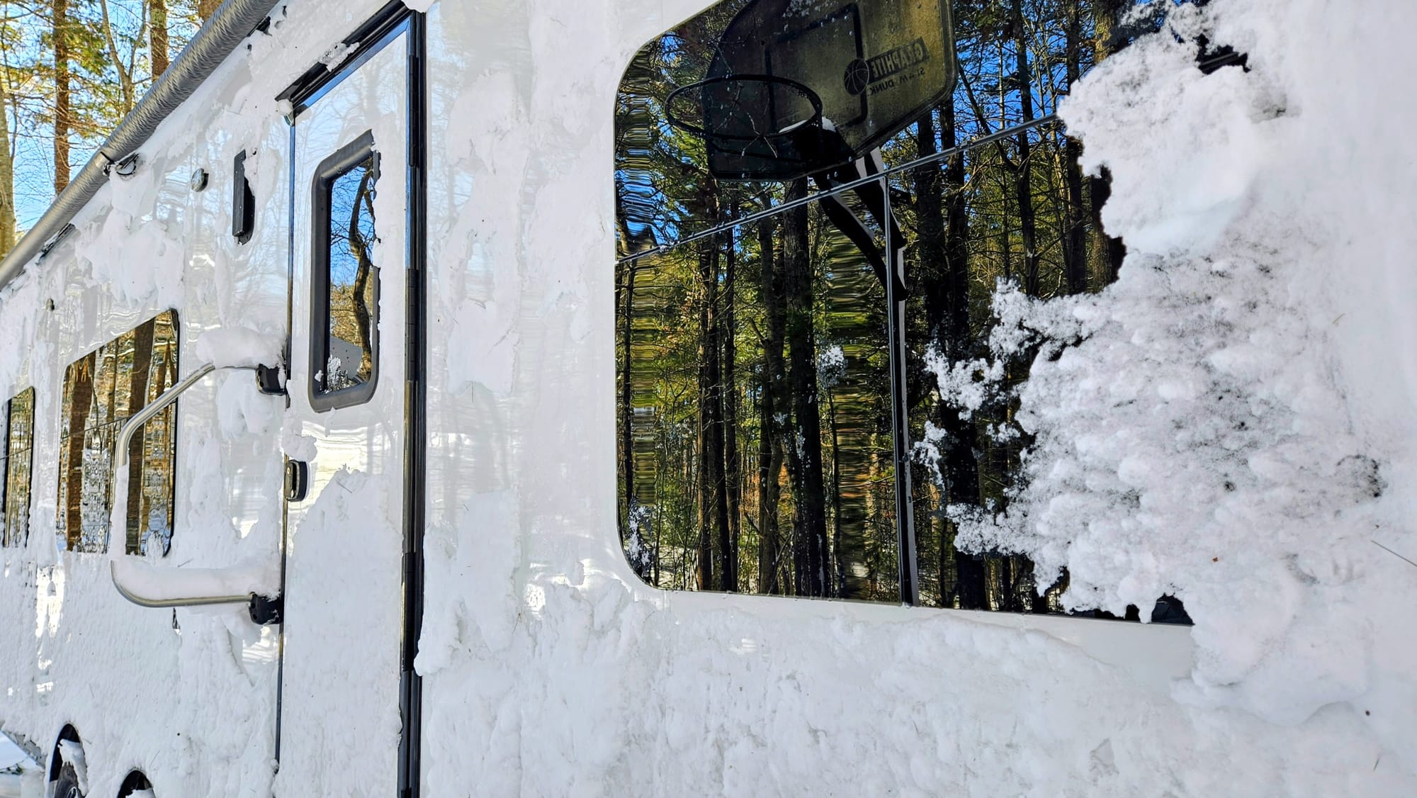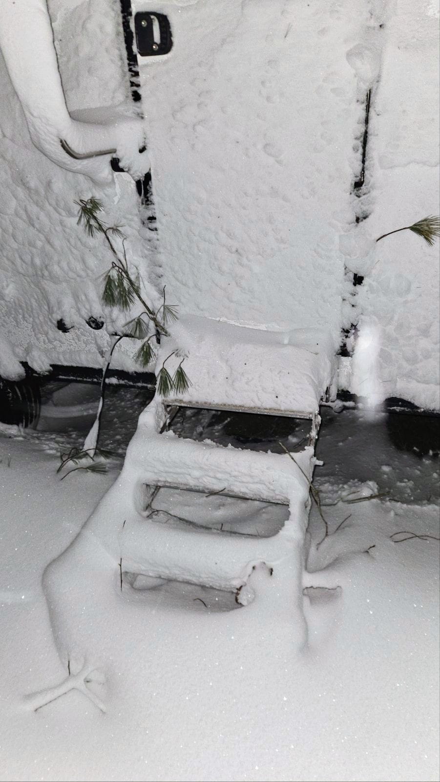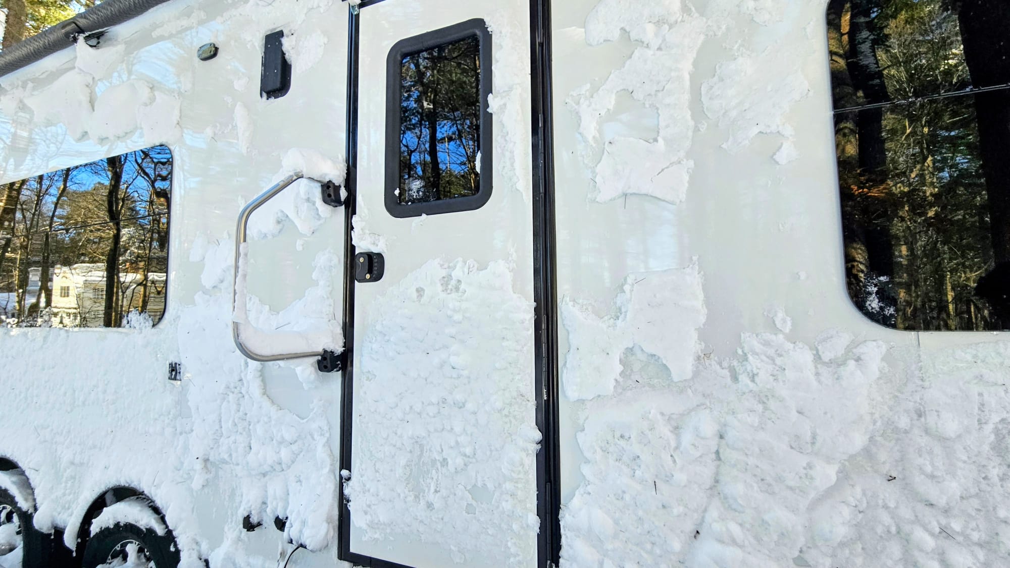 The amount of snow and ice caked on the RV exterior was unbelievable. We had never seen anything like it! Looking at the mess, we had to think about how much worse the damage could be. Buggy could have blown off-kilter, but he stayed strong...and frozen to the ground. We could have had a full tree hit our roof! One leak? We were getting off easy...