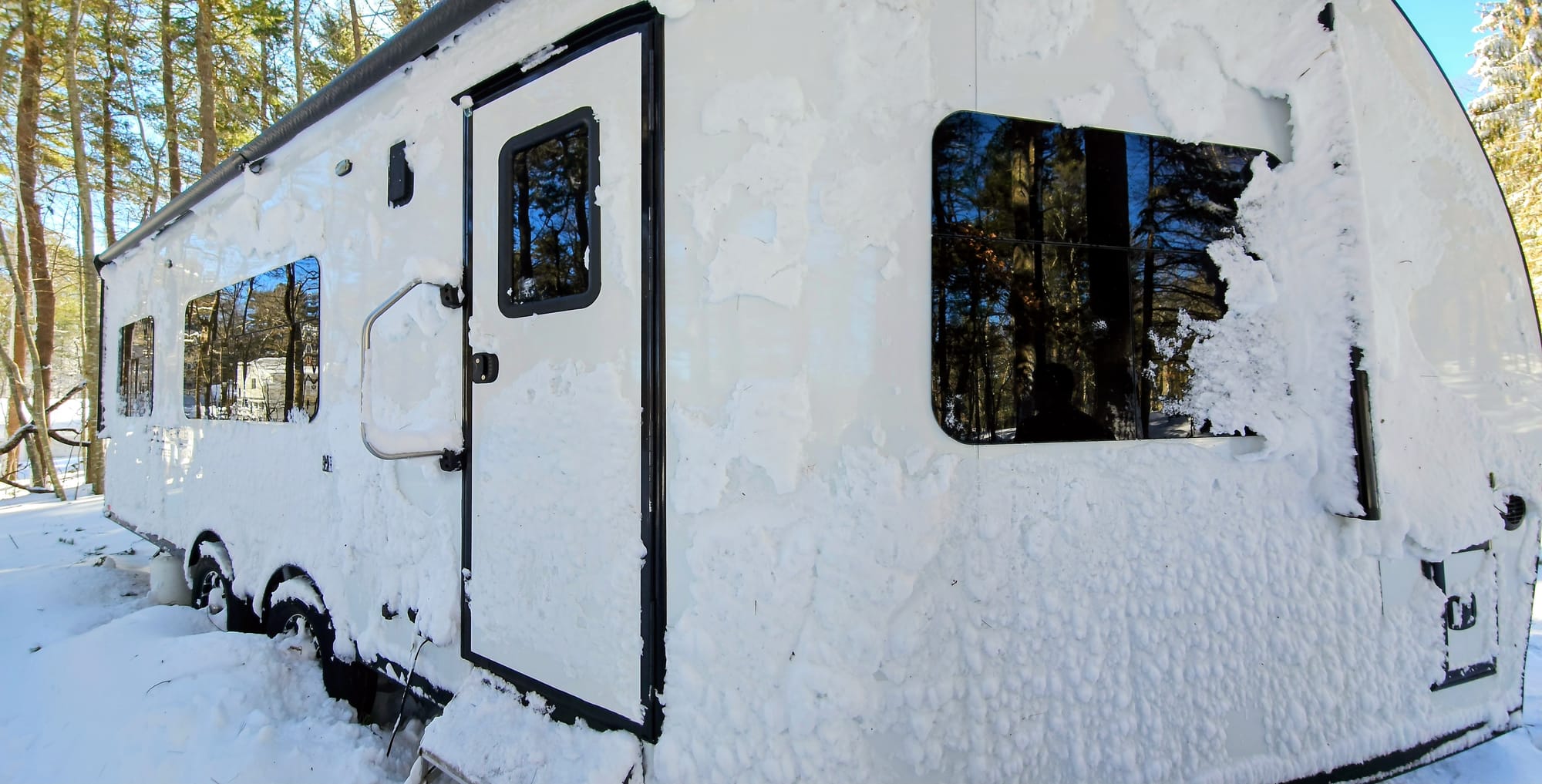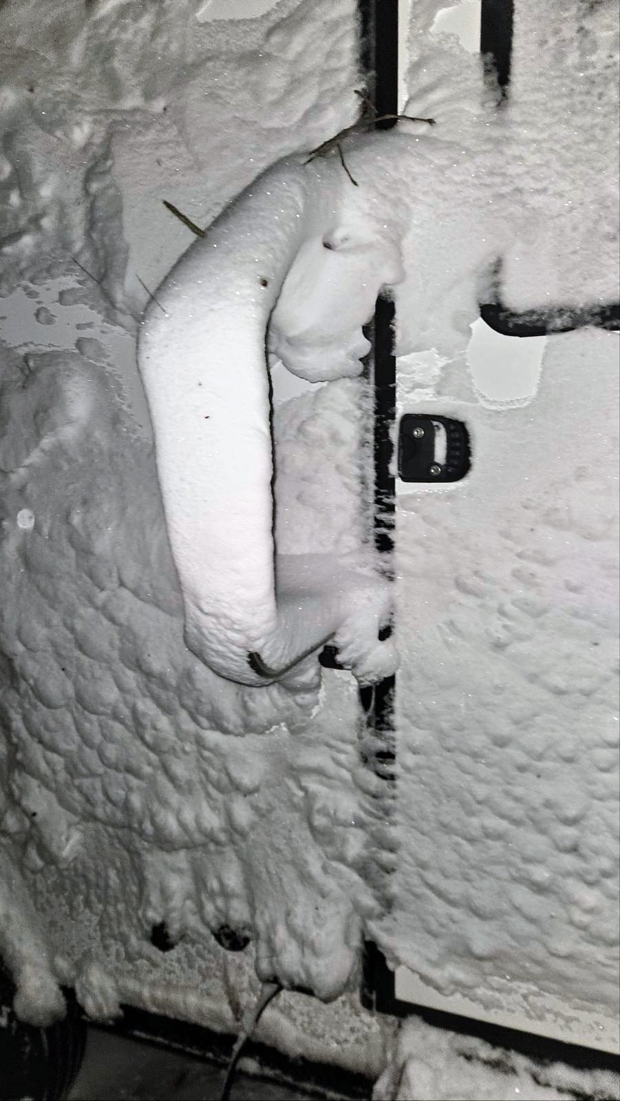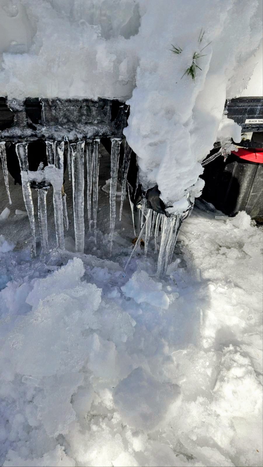 The amount of snow and ice caked on the RV exterior was unbelievable. We had never seen anything like it! Looking at the mess, we had to think about how much worse the damage could be. Buggy could have blown off-kilter, but he stayed strong...and frozen to the ground. We could have had a full tree hit our roof! One leak? We were getting off easy...