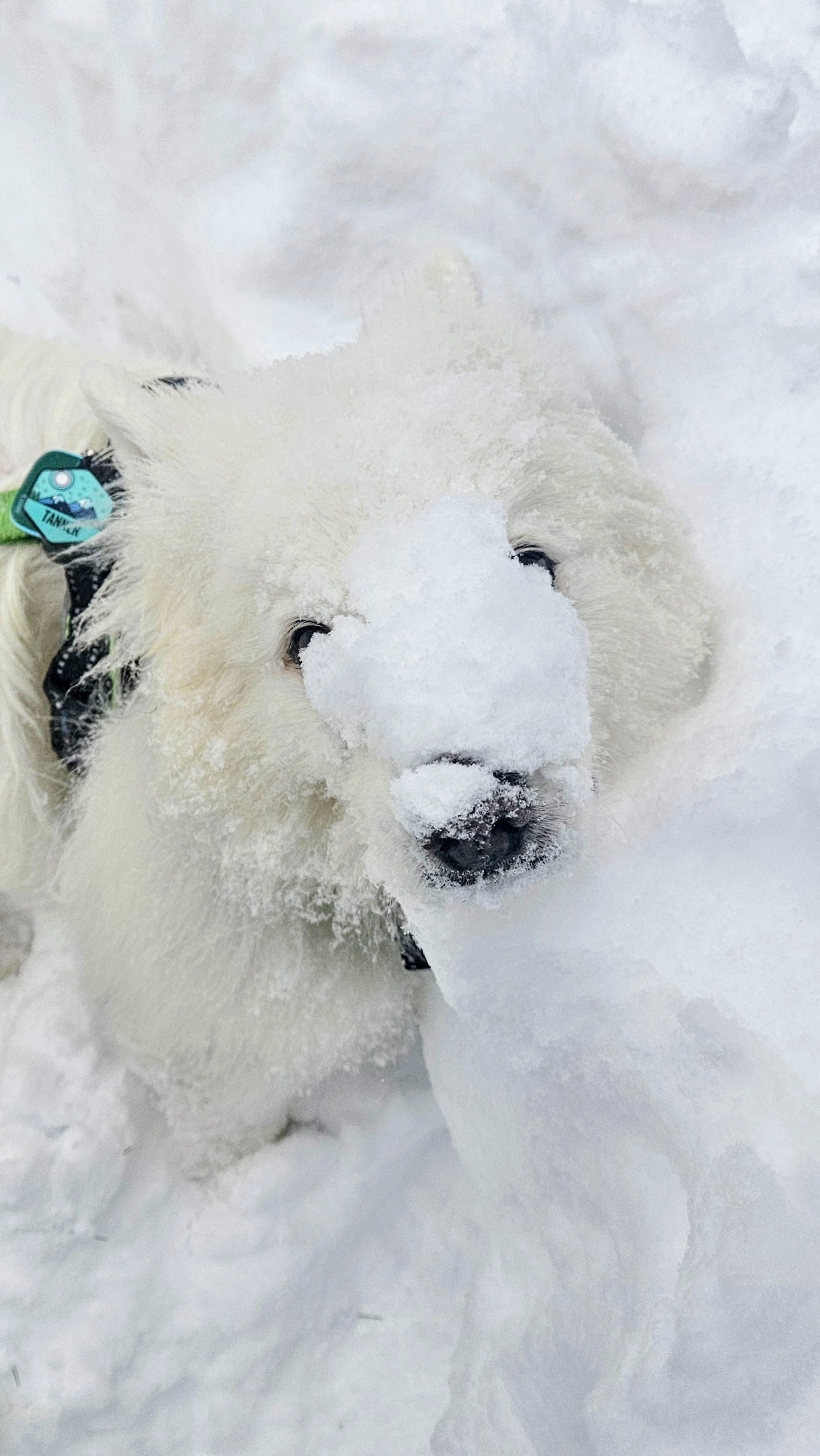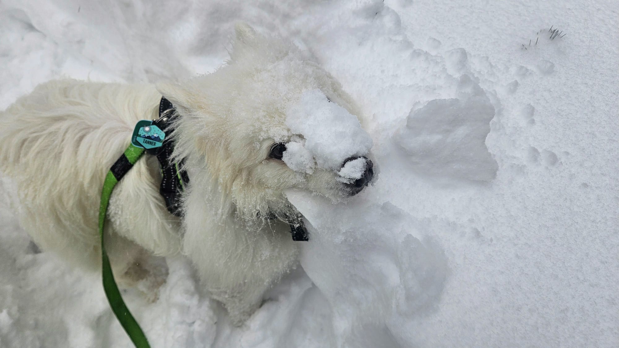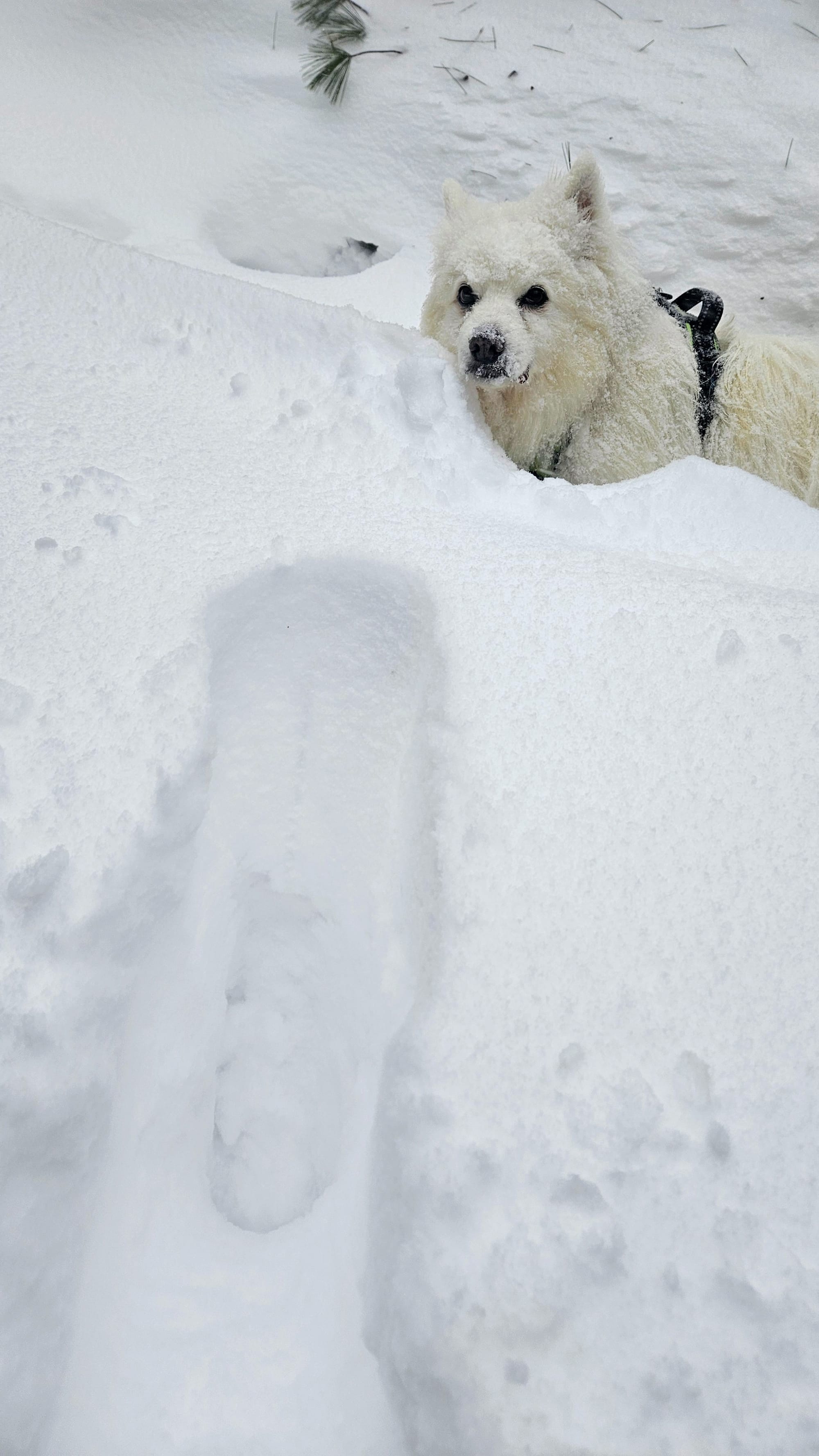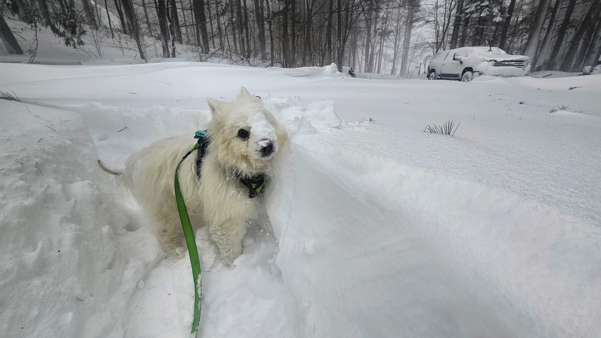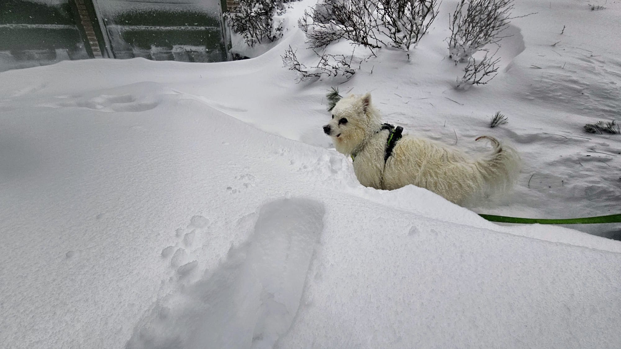 We had a couple of short outages and lots of flickering lights, but the power lasted until around 2pm. Since we have our battery bank and generator in the RV, we would be able to get power there, but we wouldn't have access until the storm died down and we could shovel a pathway across the driveway. By that point, we had close to 2 feet of snow and lots of snowdrifts. How high is 2 feet? About one American Eskimo's worth.