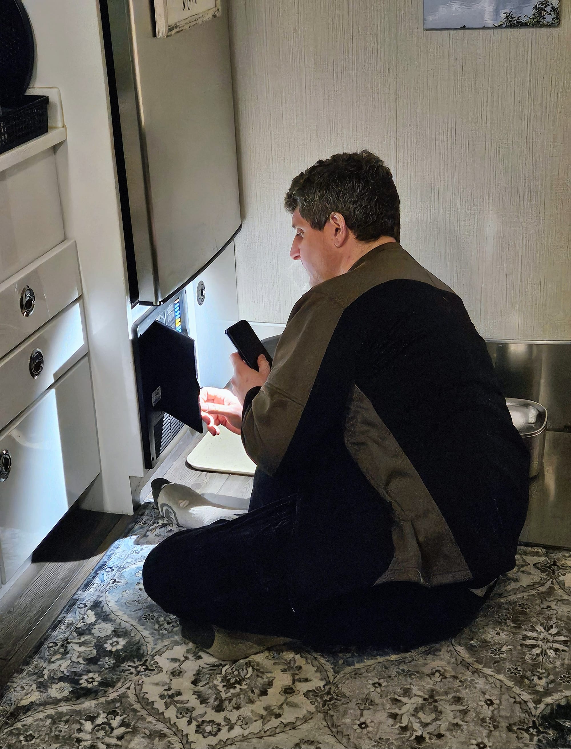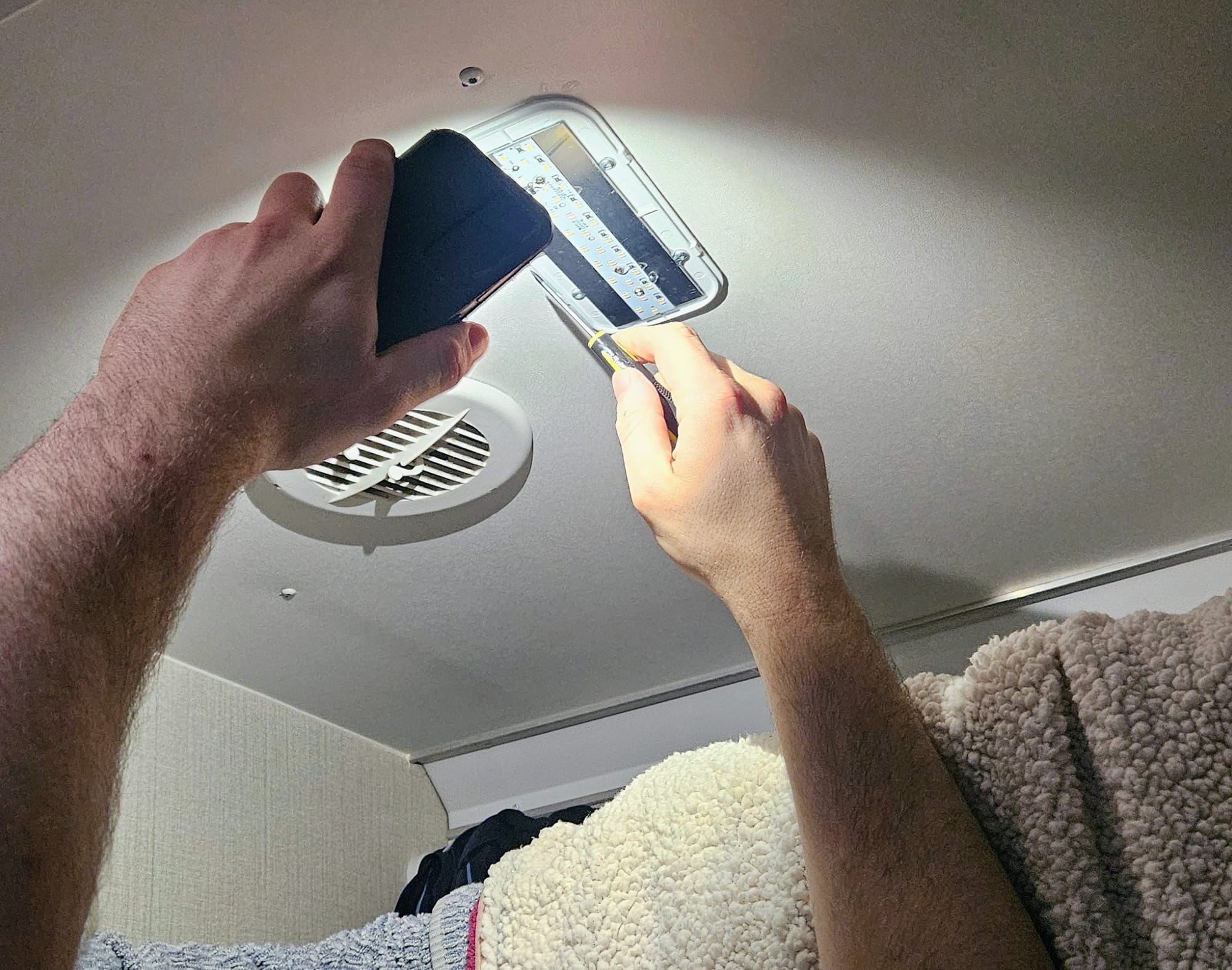 We decided to stay inside the house through the night, which meant trying to stay warm as the temperatures dropped. As soon as the worst of the storm passed, Anthony dug our path to the RV and cleared the generator exhaust pipe so we would be ready to move back in the next morning. We took the opportunity to charge some of our devices. That's when Nicole noticed something really unfortunate: a leak coming through our bathroom LED light.