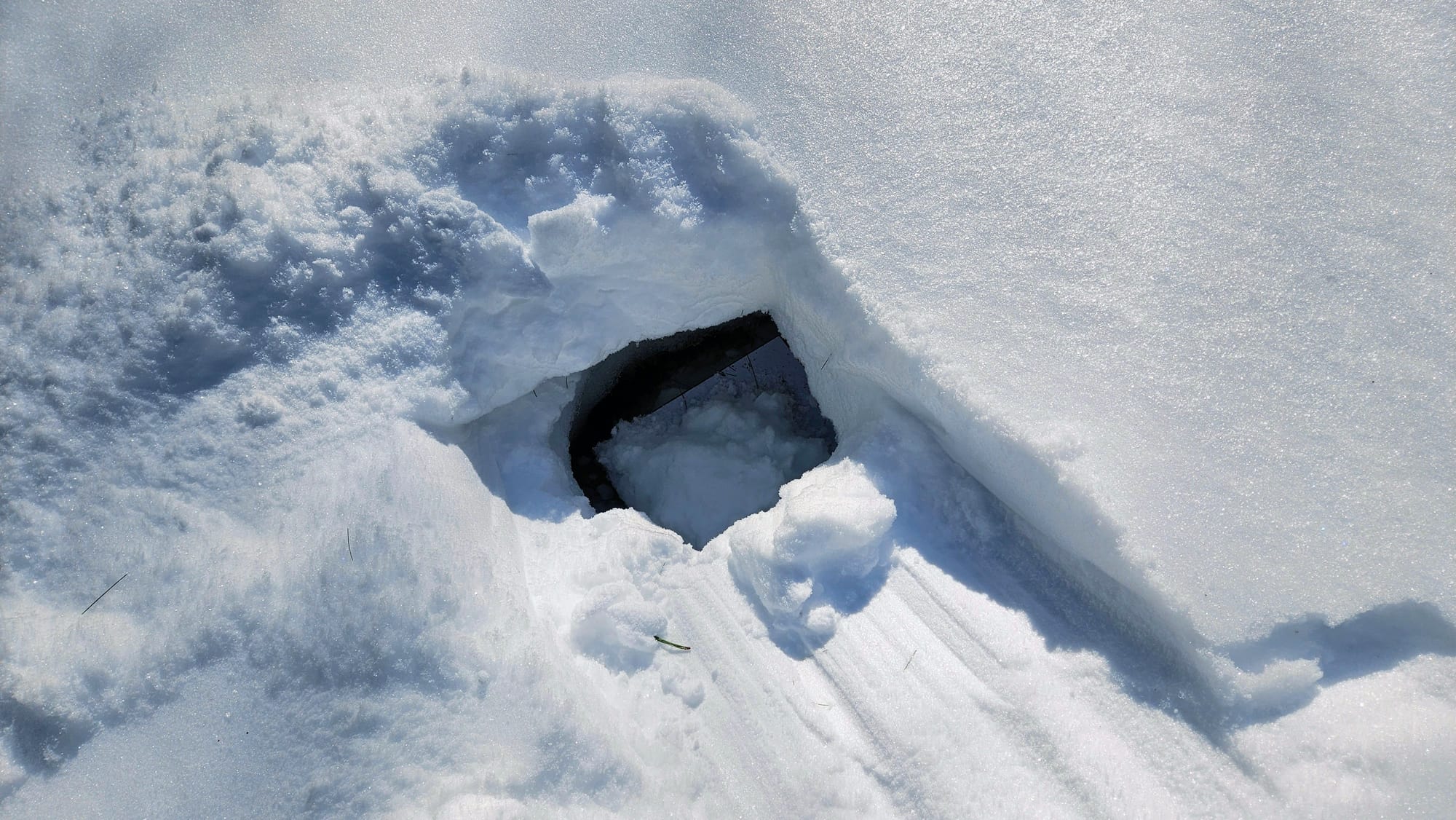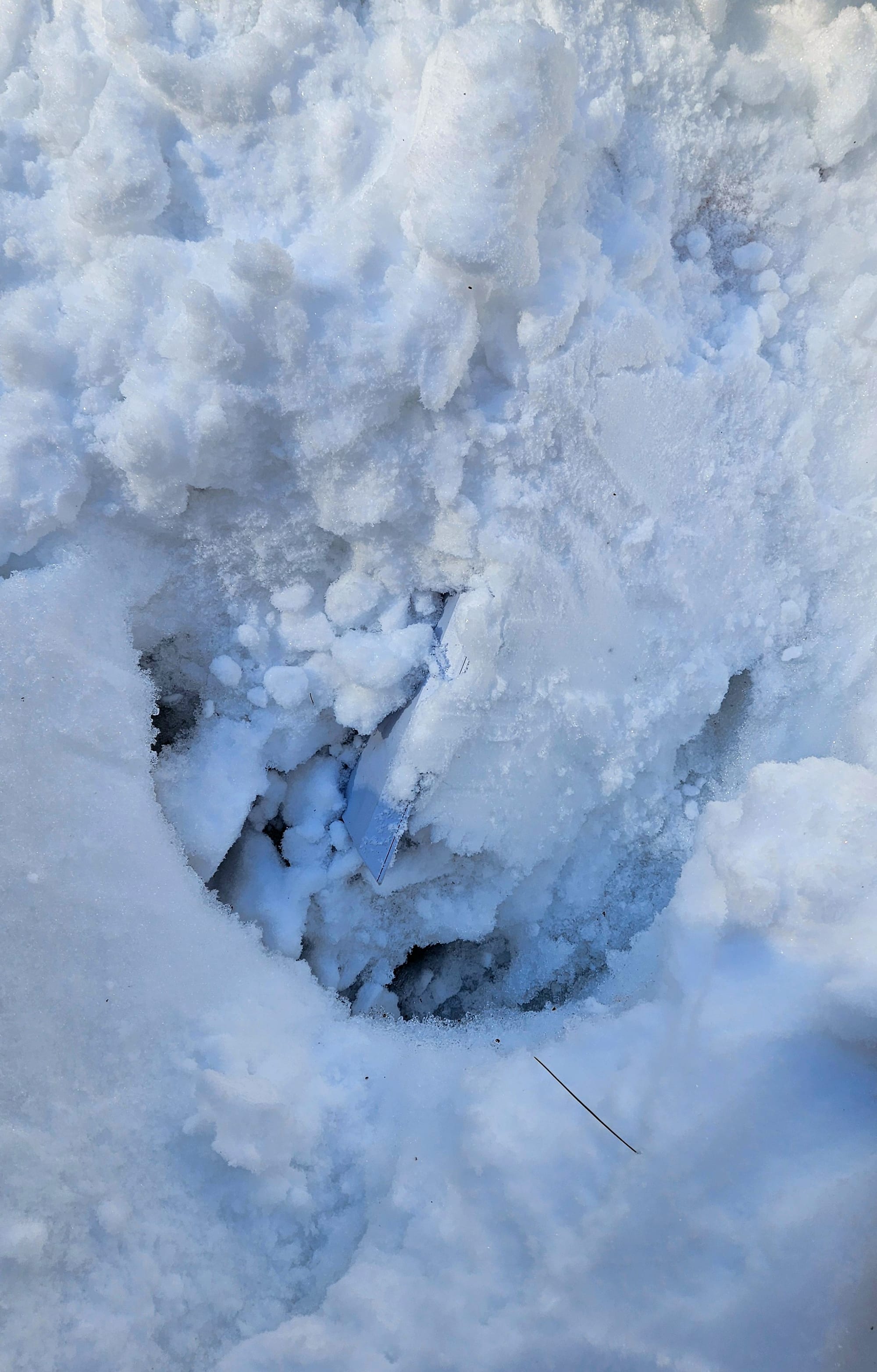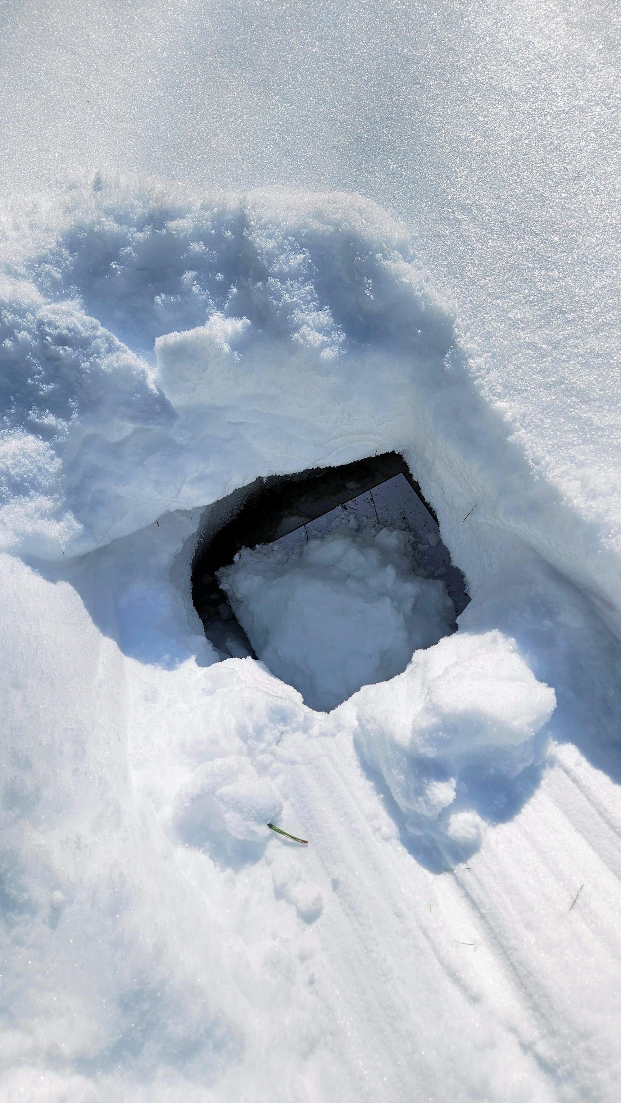 Because the dish was only buried in the recent snow, we didn't need to do much shoveling before it appeared in a hollow cave. First mission: complete!