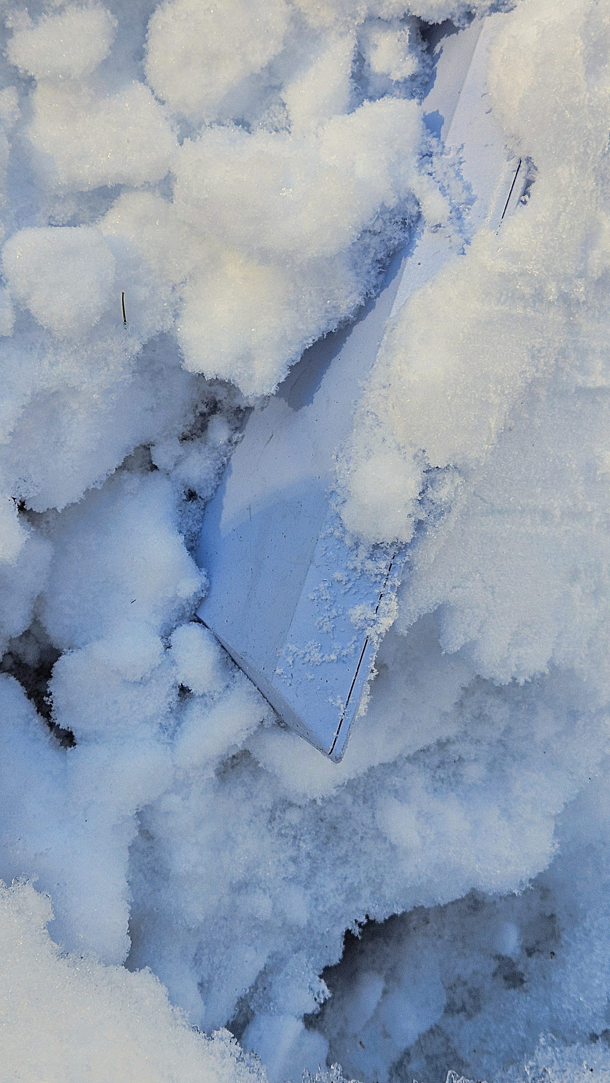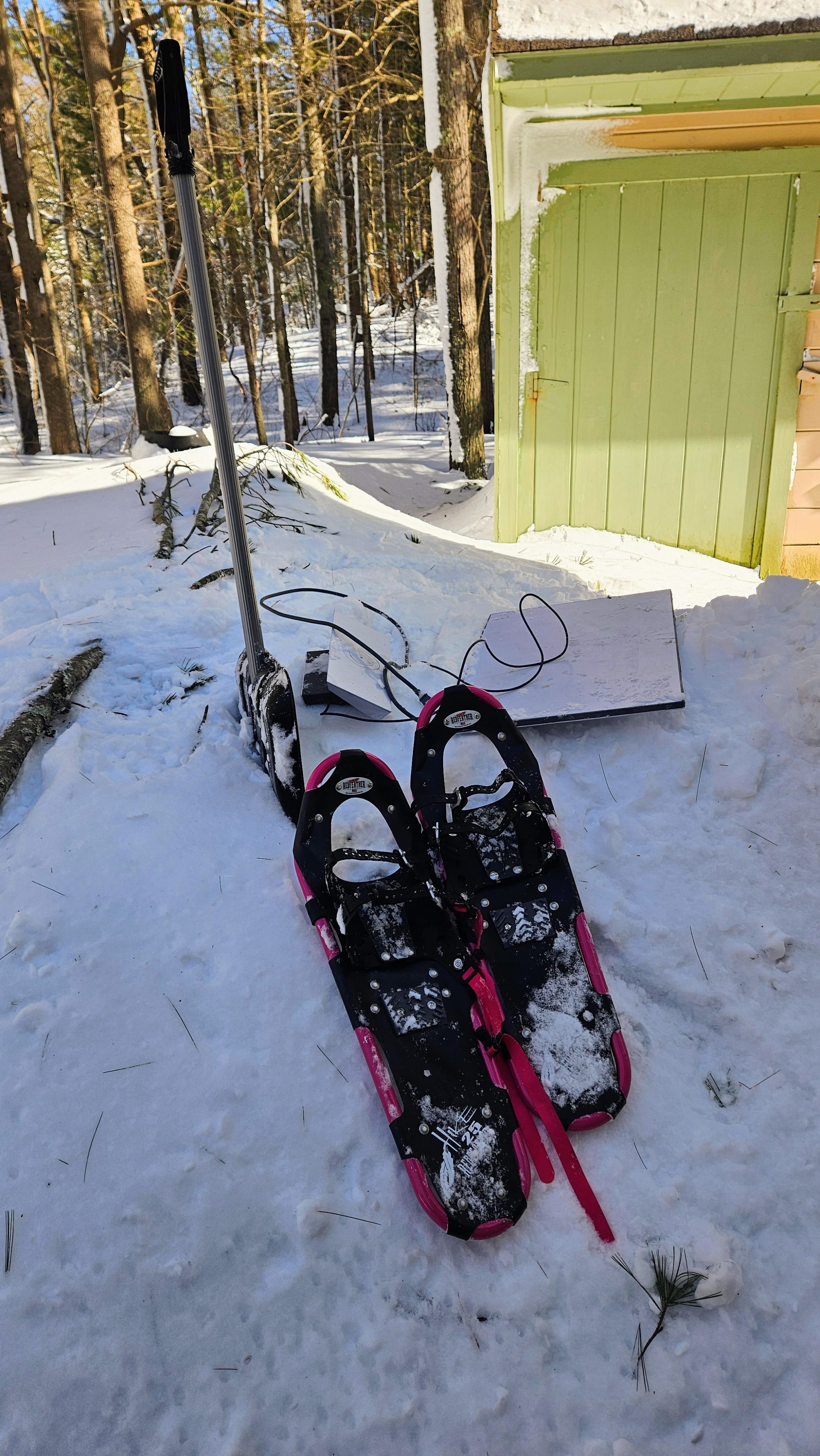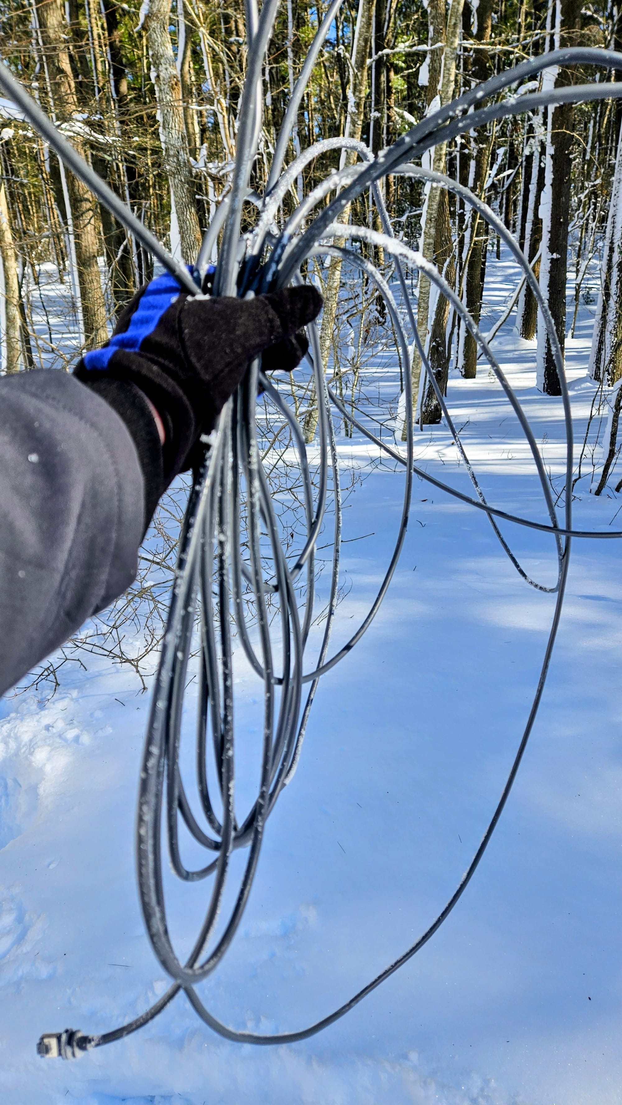 The plan was to first dig up the dish and then see if we could free the attached data cable. The cable had been acting faulty since October, and we already had a replacement. This gave us peace of mind; if we couldn't dig it up, we could just use the new one. However, if we could retrieve it, we could follow the cable to find the router. The router was somewhere by the back corner of the house, about 30 feet away from the dish, and it doesn't have a heating element, so it was even more buried than the dish. We knew it could end up being a long treasure hunt.