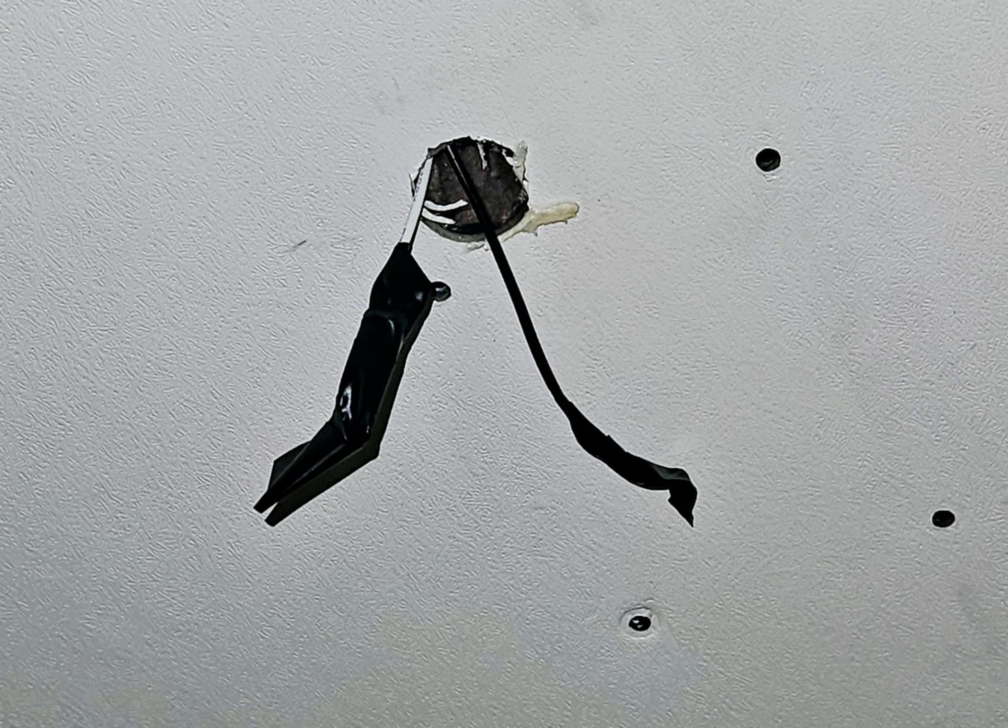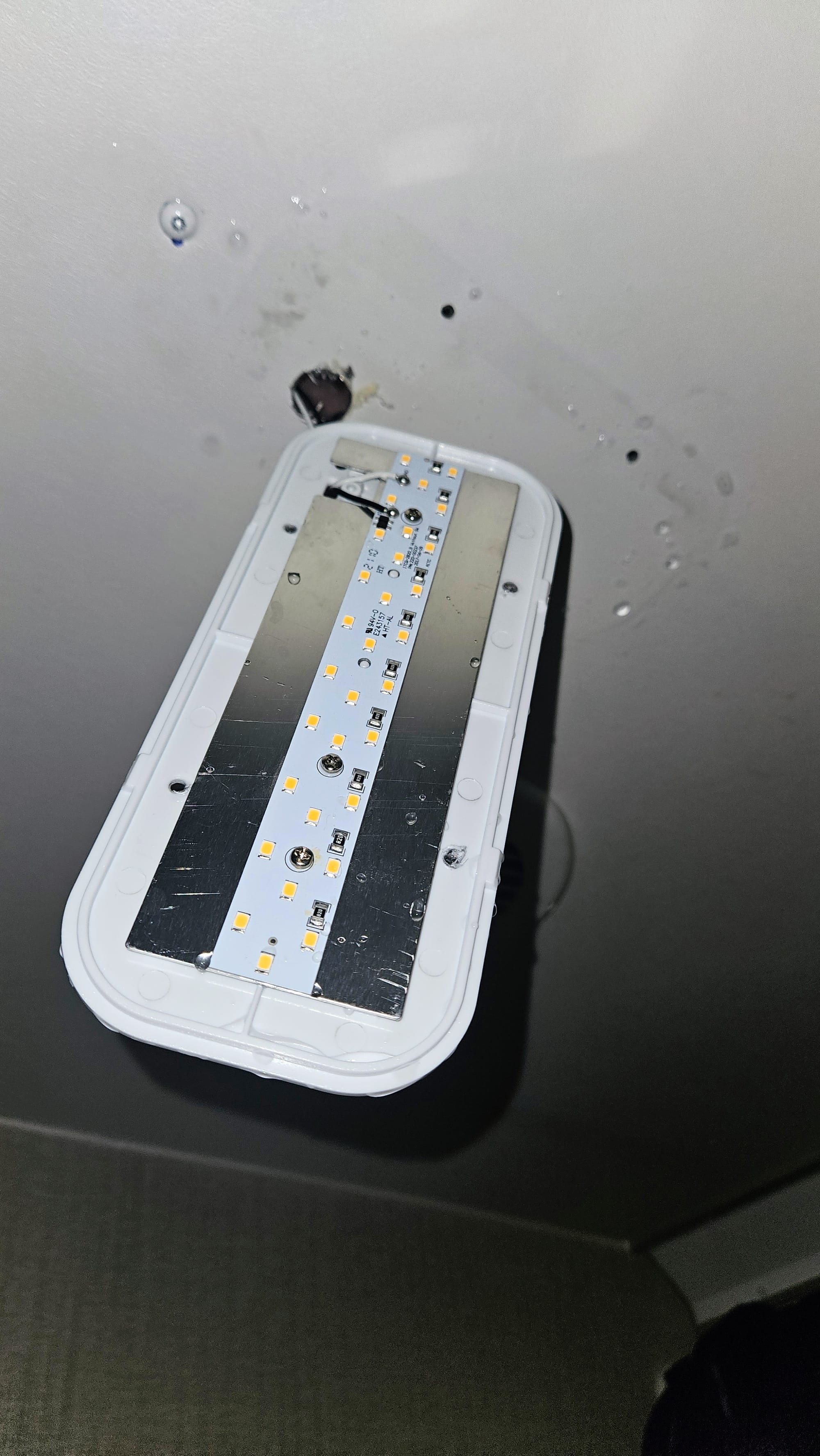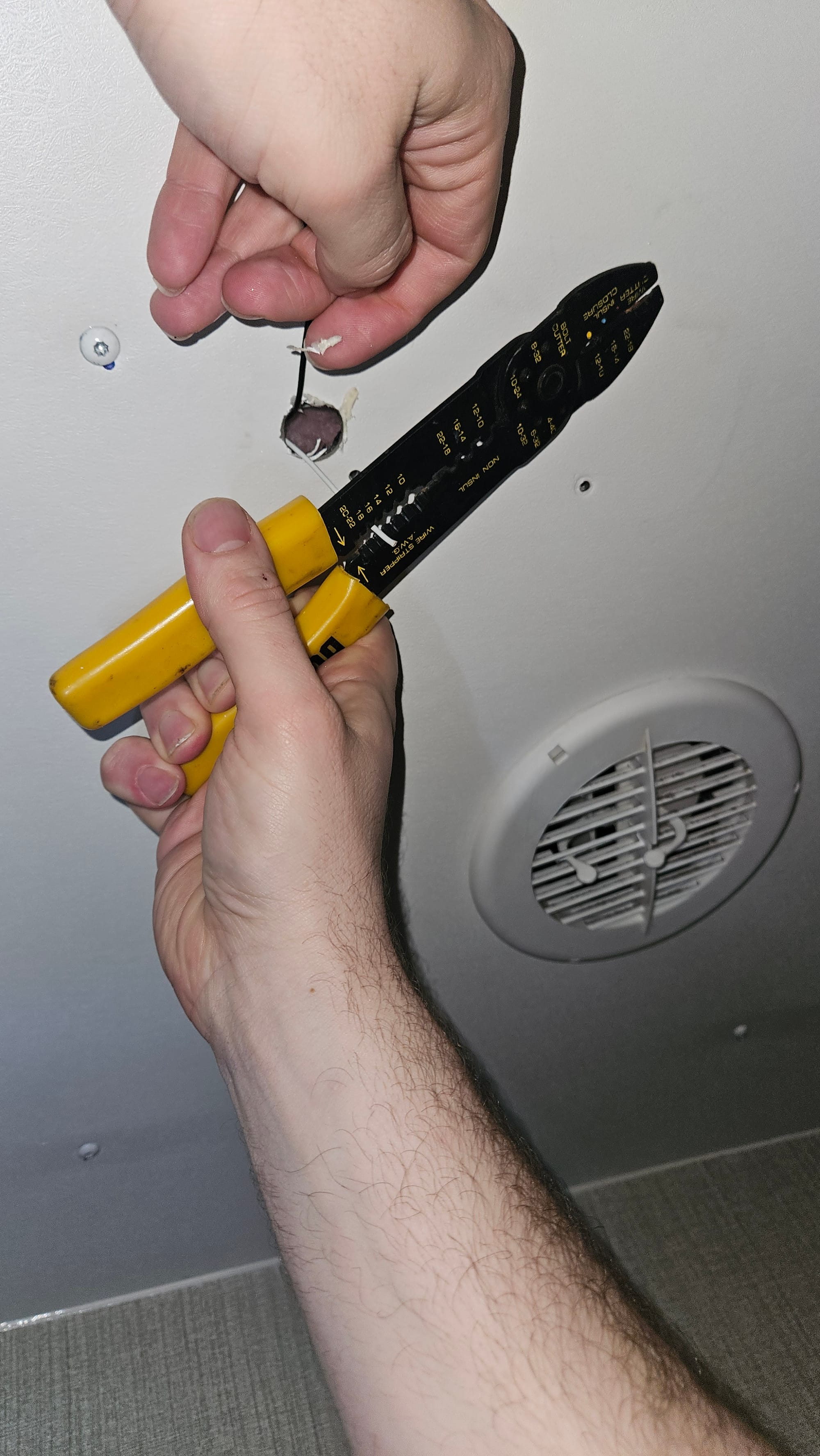 We headed back inside and immediately got to work disconnecting the bathroom light. We removed the LED, cut and stripped the wires, and wrapped them with electrical tape. The dripping had slowed down, so we were able to replace the pot with a towel. We'll need to cap the wires and use the over-sink bathroom light until further notice.