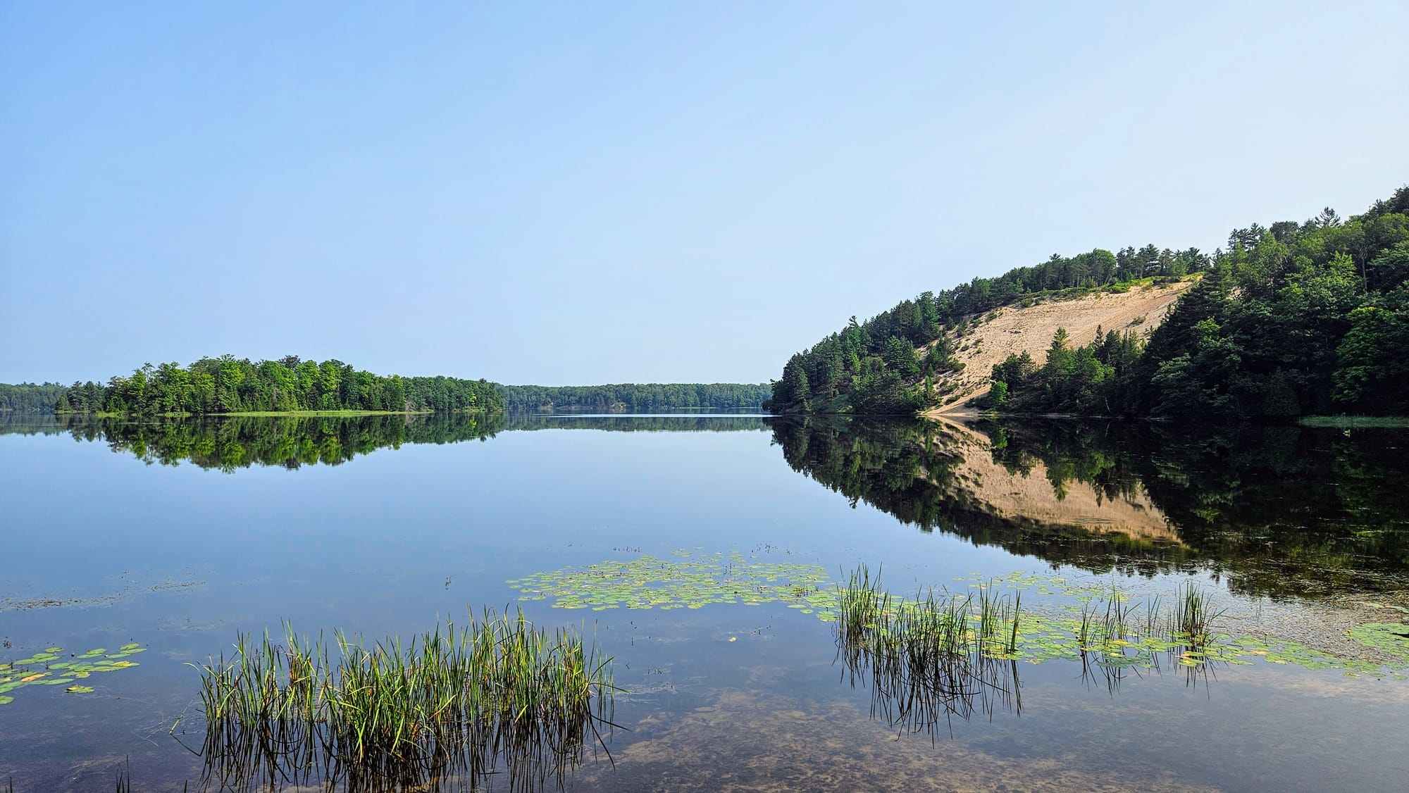 After a few hikes from our various state park campgrounds, we found ourselves in Huron-Manistee National Forest, camping at Lumberman's Monument. All Trails recommended the Highbanks Trail, a hiking and XC skiing trail that we could access from the visitor's center. The weather was gross. The sun felt extra hot beating through the thick, humid air, and the mosquitoes were relentless. I couldn't even put the bug spray away or else more would swarm around my head. Next time we go to Michigan, we're buying ourselves some bug nets. If it weren't for these less-than-ideal circumstances, we would have quite enjoyed this hike. It had some nice views, interesting features, and a mixture of terrains.