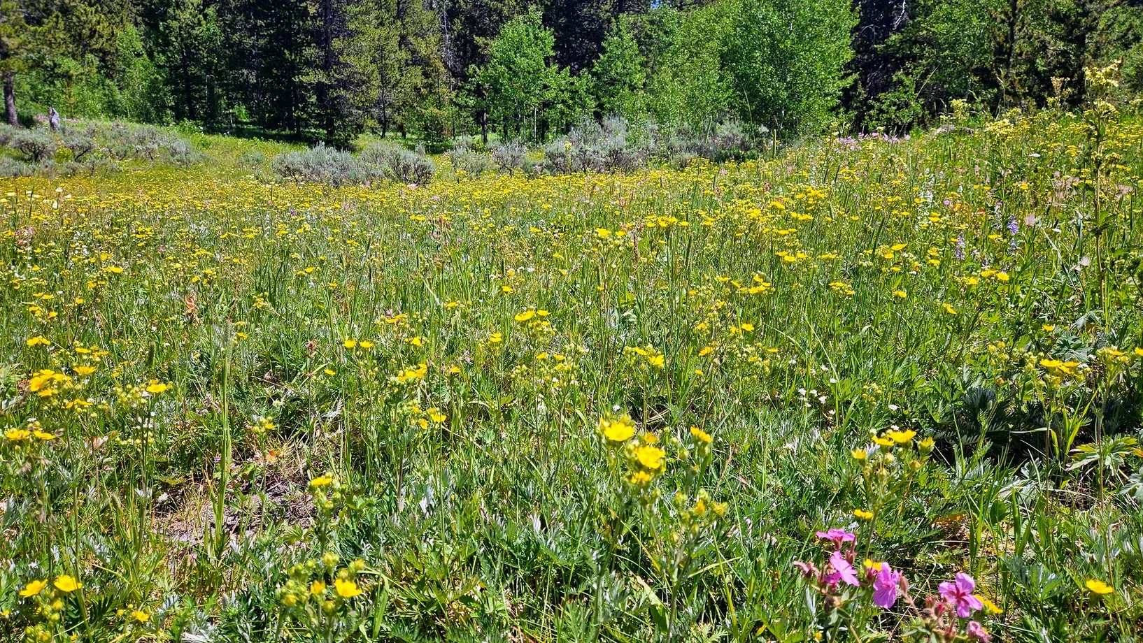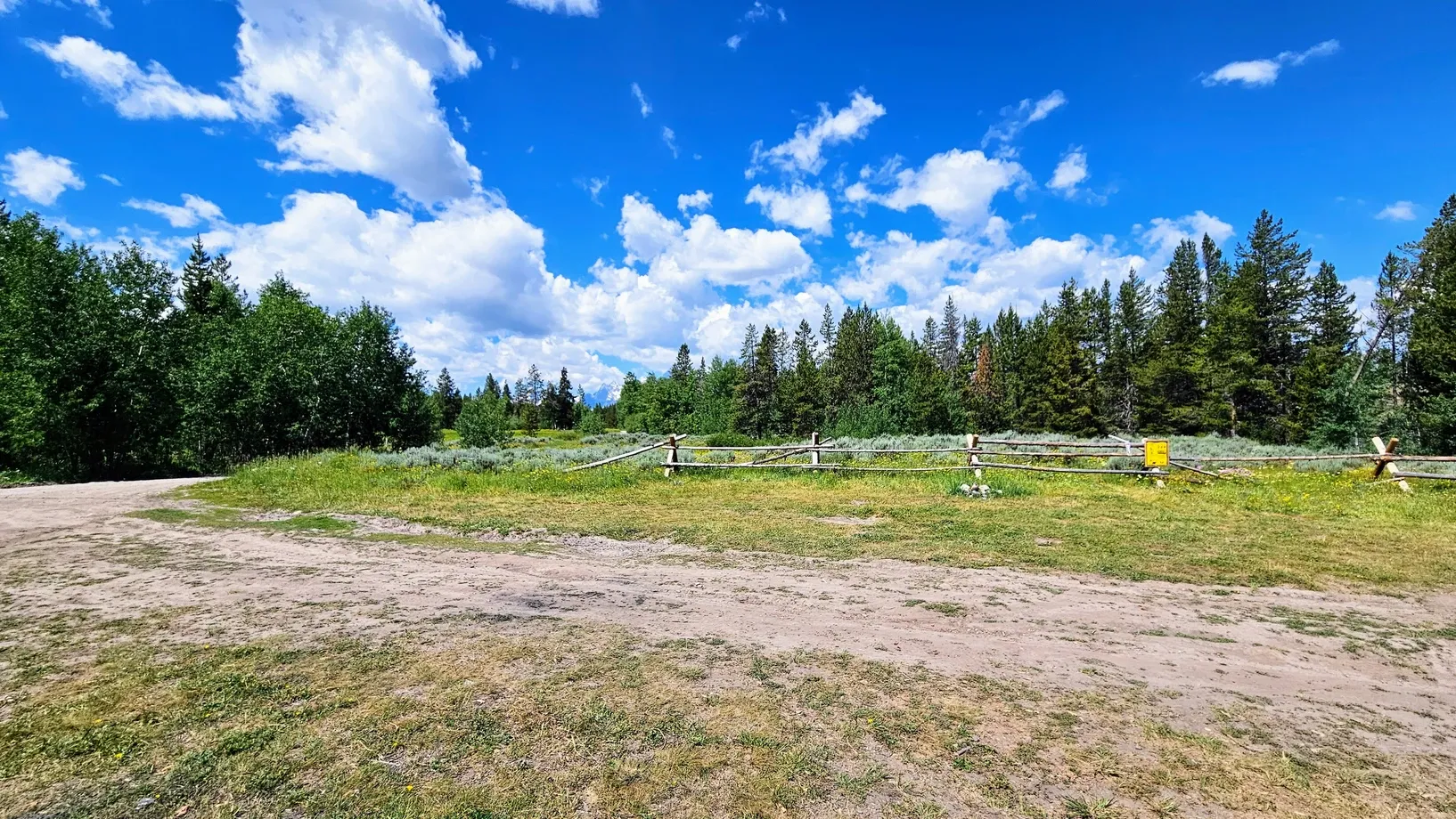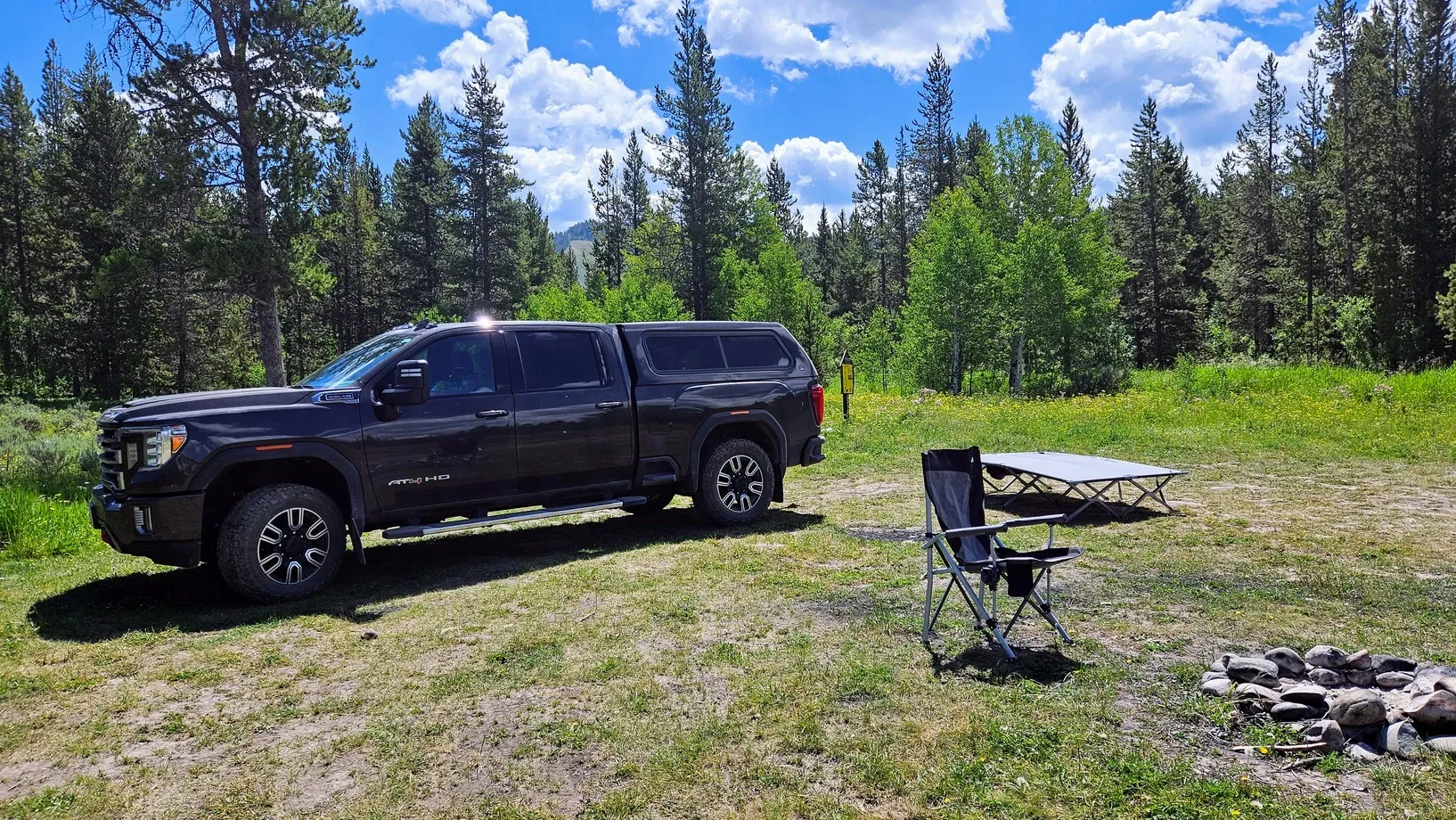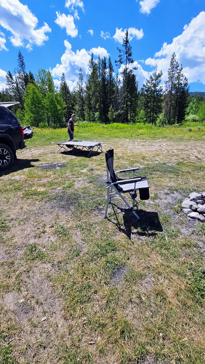 Scouting yielded us a few sites that were contenders for our rig - plus we discovered a few amazing sites that were either already filled or too small for us. We ended up dropping our stuff at a site in Toppings Lake Dispersed Camping area, which is in the same area as the Upper Teton holy grail. We left our tent cot and a camping chair in site 21A. Site 21 is subdivided into three sections, 21, 21A, and 21B. None of the sites were occupied when we got there. 21B was up a hill and had a lot of sketchy ruts, so that was out. 21 and 21A were situated across from one another, and while 21 had potentially better views of the tops of the Tetons, 21A was larger and would fit our trailer best. We looked forward to having a little Teton view across the way, as long as the dweller in 21 didn't block it, and we also had a field of colorful wildflowers on our other side.